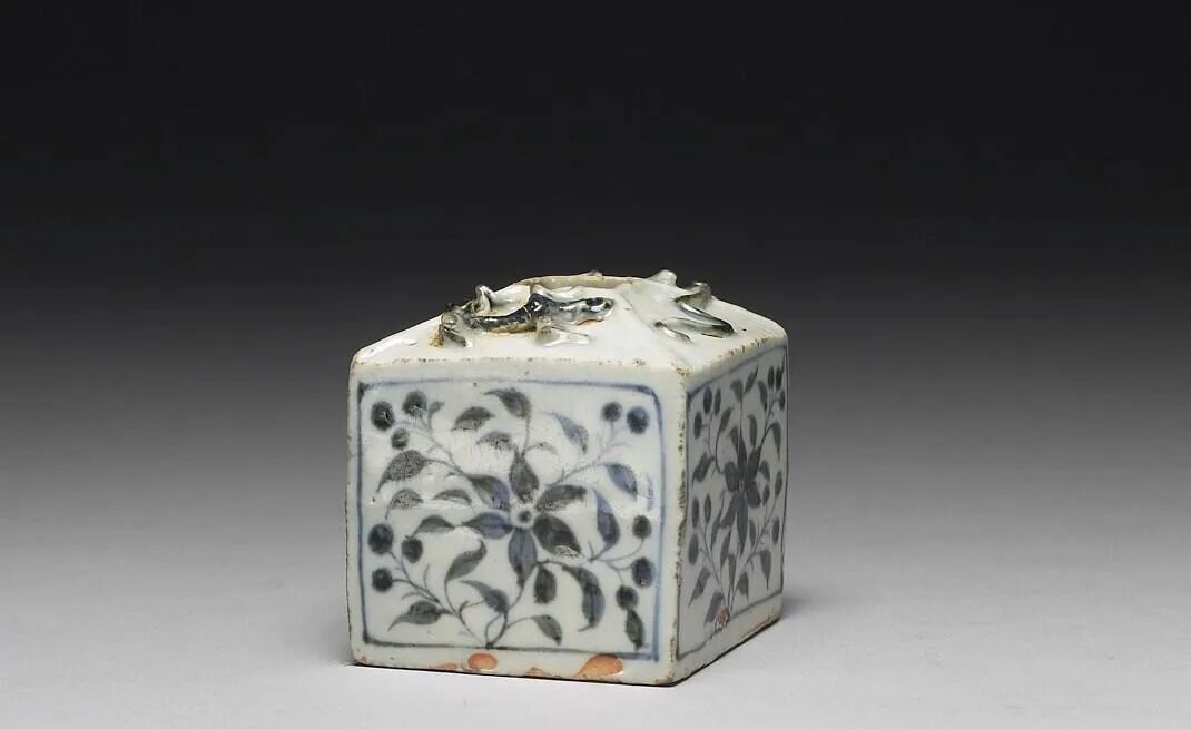 盖面饰两条泥条捏塑的褐色蟠螭,四面各以钴料描绘花卉折枝果纹,近底部与底部露胎无釉。东南亚地区则多出此类小型罐,青料或出于国产,关注公众号:高古瓷。色调泛灰。此类方形小罐亦有青白瓷与釉裡红类型。