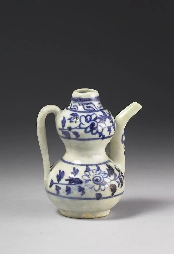 青花葫芦式执壶,小口、细腰葫芦式瓶身,一侧曲把拱起衔接上下身,另一侧的管状长流从下腹部高竖起再向外曲折;饼形足,平底无釉,沾有窑渣。此种注子造形为元代所常见,有青花、青白瓷、褐斑青白瓷等装饰。本件青花注子,器壁以青花绘饰,口缘一道回纹,上下腹各绘连枝花卉,流的壁上也绘一小枝花,笔法简率,与其他贩至东南亚的小件青花器的绘法一致。外壁罩以灰青色釉。