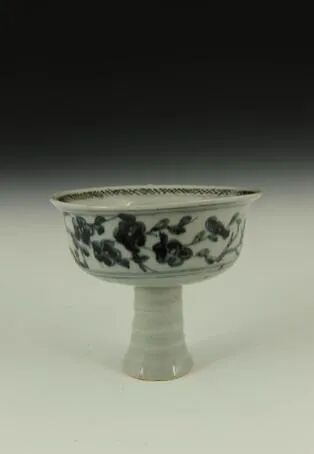 该杯采用抖接成型。上部为碗形,口沿外撇,深腹稍外弧,杯心平坦,下承喇叭状、竹节型高柄足,足中空,足端平切露胎。杯外壁在向下两组弦纹之间,绘“岁寒三友”图一组,内壁口沿处绘青花网纹一圈,内底绘折枝菊一朵,外绘双弦纹。