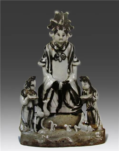 施青白釉,釉不及底,底部露胎呈土黄色。观音胸前青花如意纹清晰可见。发、衣领、披肩、衣袖边采用青花褐彩并用施彩。这是一件有明确纪年墓葬出土的元青花观音像,它的出现引起了海内外同仁的关注。它为我国研究早期青花瓷提供了极为珍贵的资料。