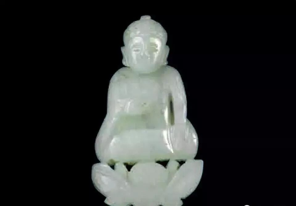 玉质白色,温润纯净。扁平体。头生螺发,顶部有肉髻。双耳至肩,眼眶内凹,闭目养神,高鼻,小嘴,左手扶膝,右手持怀,结跏趺坐于莲座上,后背阴线勾饰几何纹,中部有牛鼻孔。