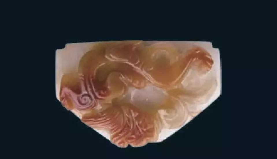 玉质白色,略带沁。长方形。一端长伸斜切,一端短内卷,中间有一长方形孔供穿戴佩系用。正面浮雕一螭纹,头部宽,眉、鼻、眼略占整个脸部的三分之一,毛发长飘至肩部。造型呈匍匐爬行状,两前腿无力,后腿呈弓形,腿部关节处出现卷云纹表示筋骨,螭尾分叉压于后腿下。
