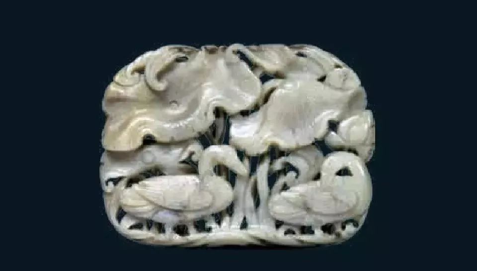 玉质青色,局部有褐色斑。圆体馒头状,底为平面,上端弧凸,通体采用多重镂空技法,雕琢茂盛的荷花丛,鹭鸶漫步其中,栩栩如生,充满了浓郁的生活气息,是承袭金代的春水玉。这类玉器本是元代官服中的帽顶,至明代,服饰体制改变,于是用作炉顶。