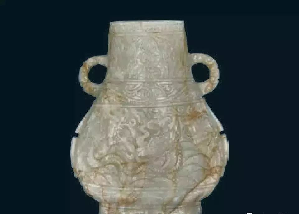 玉质青灰色,有褐色斑。圆雕,扁圆形,长方口,直颈,阔腹,双耳,圈足。口沿外刻一周回纹,颈上部雕双兽首耳,颈下部雕兽面纹带,腹部饰兽面纹,足外撇,上饰变形夔纹带。