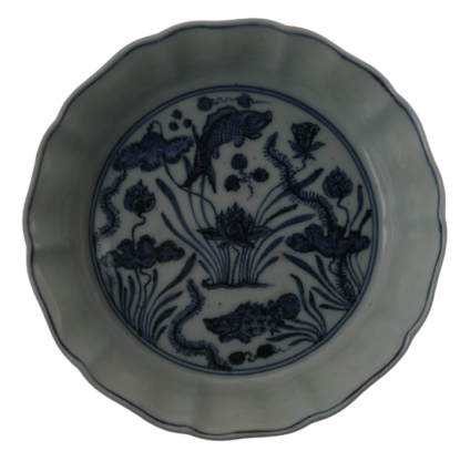 通体施釉,以青花为饰。里心与外壁均绘鱼藻纹。器底以青料书“大明宣德年制”。