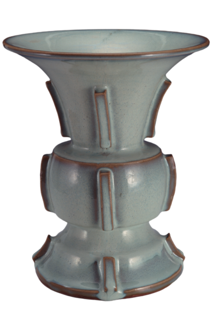 器身饰有长方体状戟,俗称“出戟”。宋明以来,复古之风盛行,此出戟尊即仿自商周时期铜酒器的造型,但已转变作书斋中的花器使用,常单只陈设于书桌上用以插花卉或珊瑚。此尊为钧州窑产品,也是“官钧”花器中的典型器型。