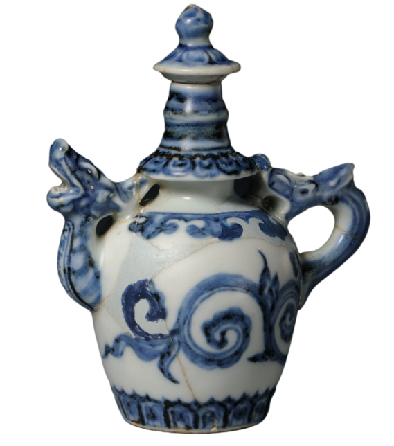 此水注为长颈竹节式,盖下子口为长管状,插入颈口不易倾落。流为一张口螭龙首,龙颈部竖书“大明宣德年制”款。柄亦为一螭龙,龙尾卷草式,以青花分绘于腹两侧。螭龙纹的形象十分生动,为宣德官窑中的文房佳器。