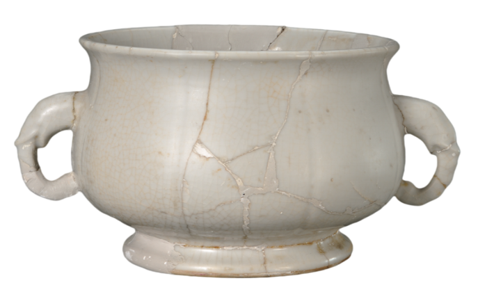 此炉与匙箸瓶同时出土于景德镇龙珠阁明代御厂成化地层堆积。腹部对称置象耳,内外均施开片哥釉,外底署青花楷体“大明成化年制”款。该香簋是明代文人雅集空间喜用炉式,此炉因烧成后变形而落选。