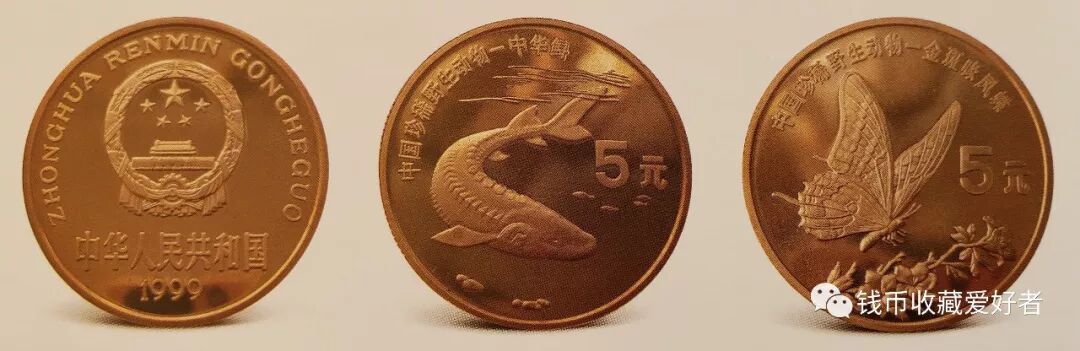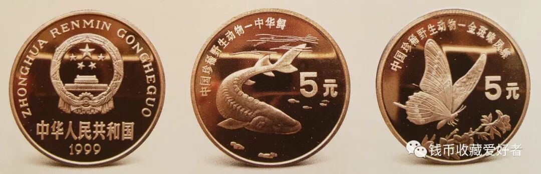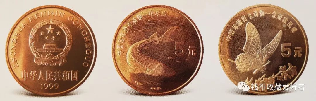 1999年中国珍稀野生动物-中华鲟、金斑喙凤蝶纪念币紫铜合金材质,直径32MM、重13.5克,发行量600万,采用侧边缘9组间断丝齿防伪,参考价40元。