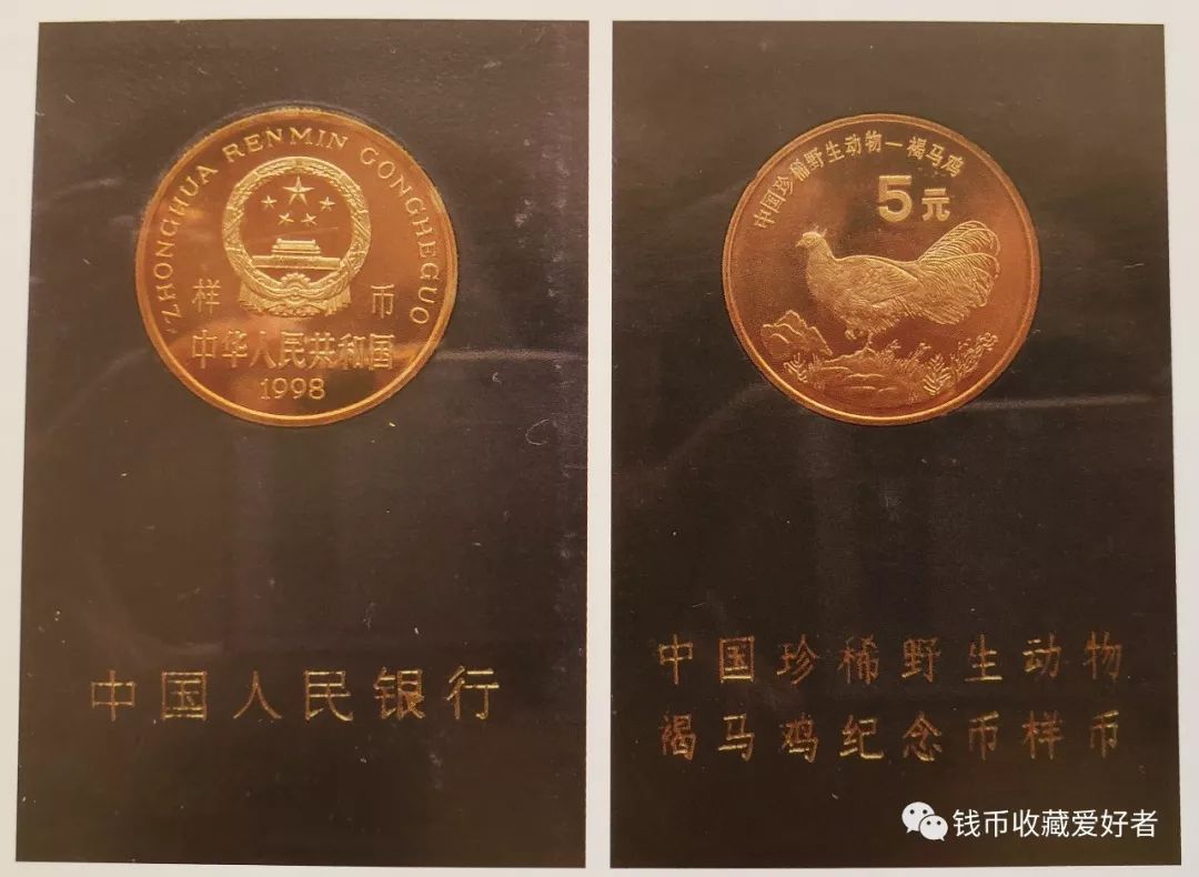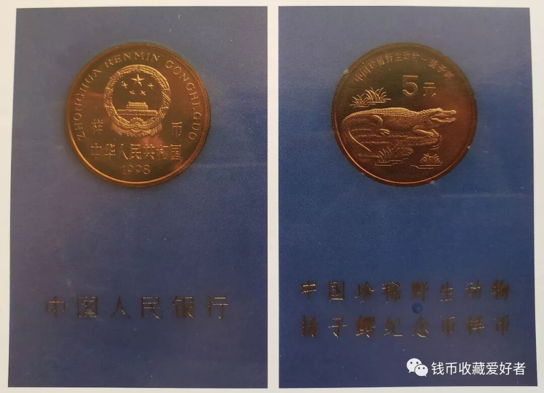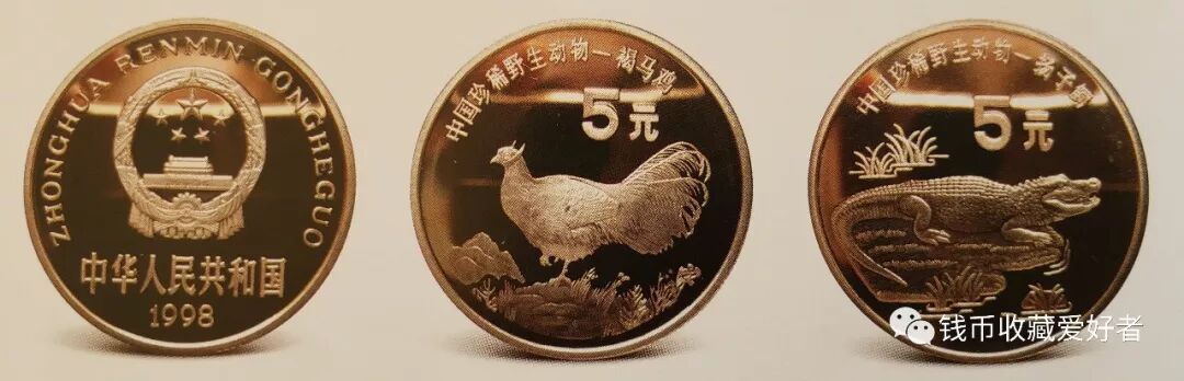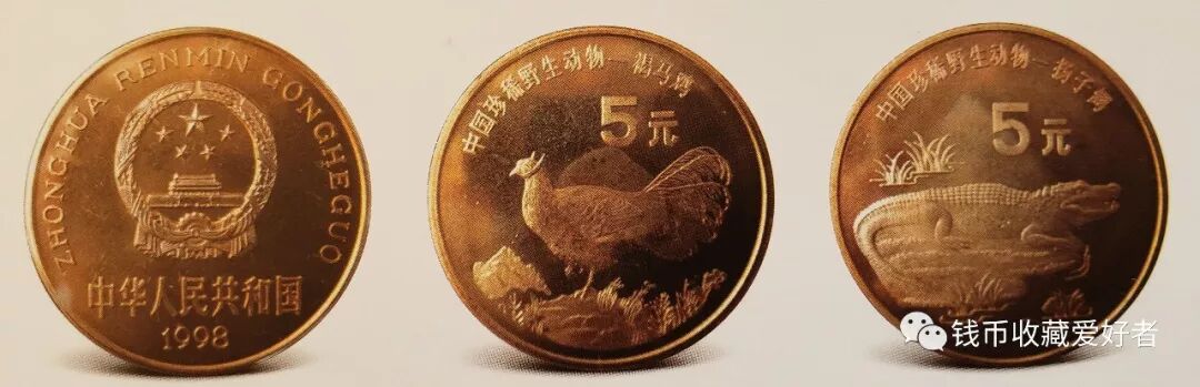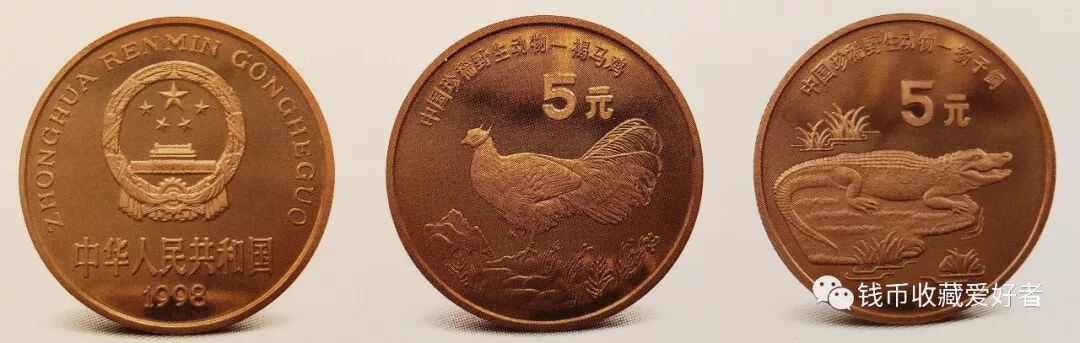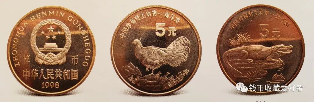 1998年中国珍稀野生动物-褐马鸡、扬子鳄纪念币紫铜合金材质,直径32MM、重13.5克,发行量600万,采用侧边缘9组间断丝齿防伪。参考价40元。