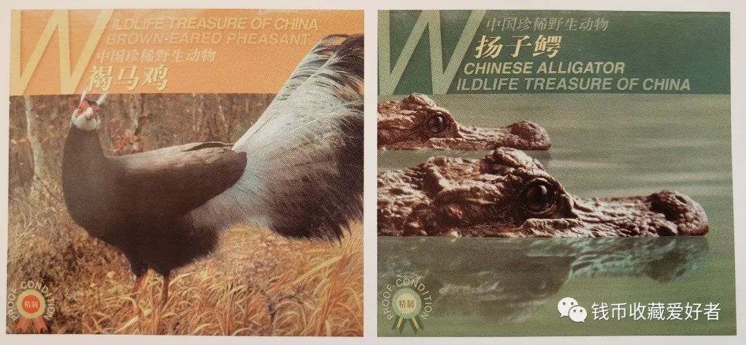 (1)纸卡包装。“褐马鸡”装帧编号98-4-1-1,“扬子鳄”装帧编号98-5-1-1,附康银阁证书,由中国人民银行货币金银局局长签发。装帧量20000套,10枚/包,200枚/箱,精美度4级,参考价800元/套。