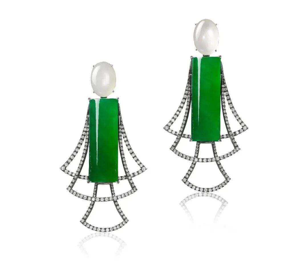 天然翡翠 配 月光石 及 钻石耳坠一对