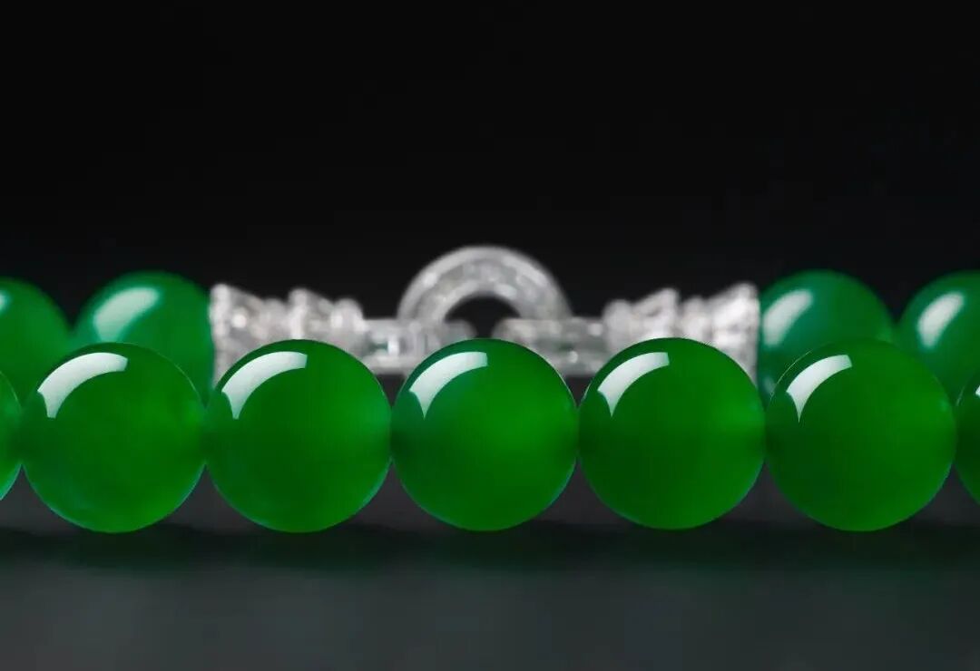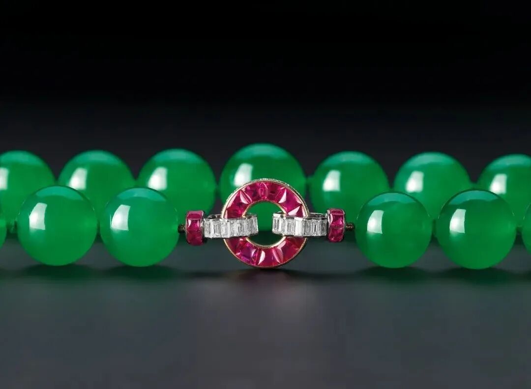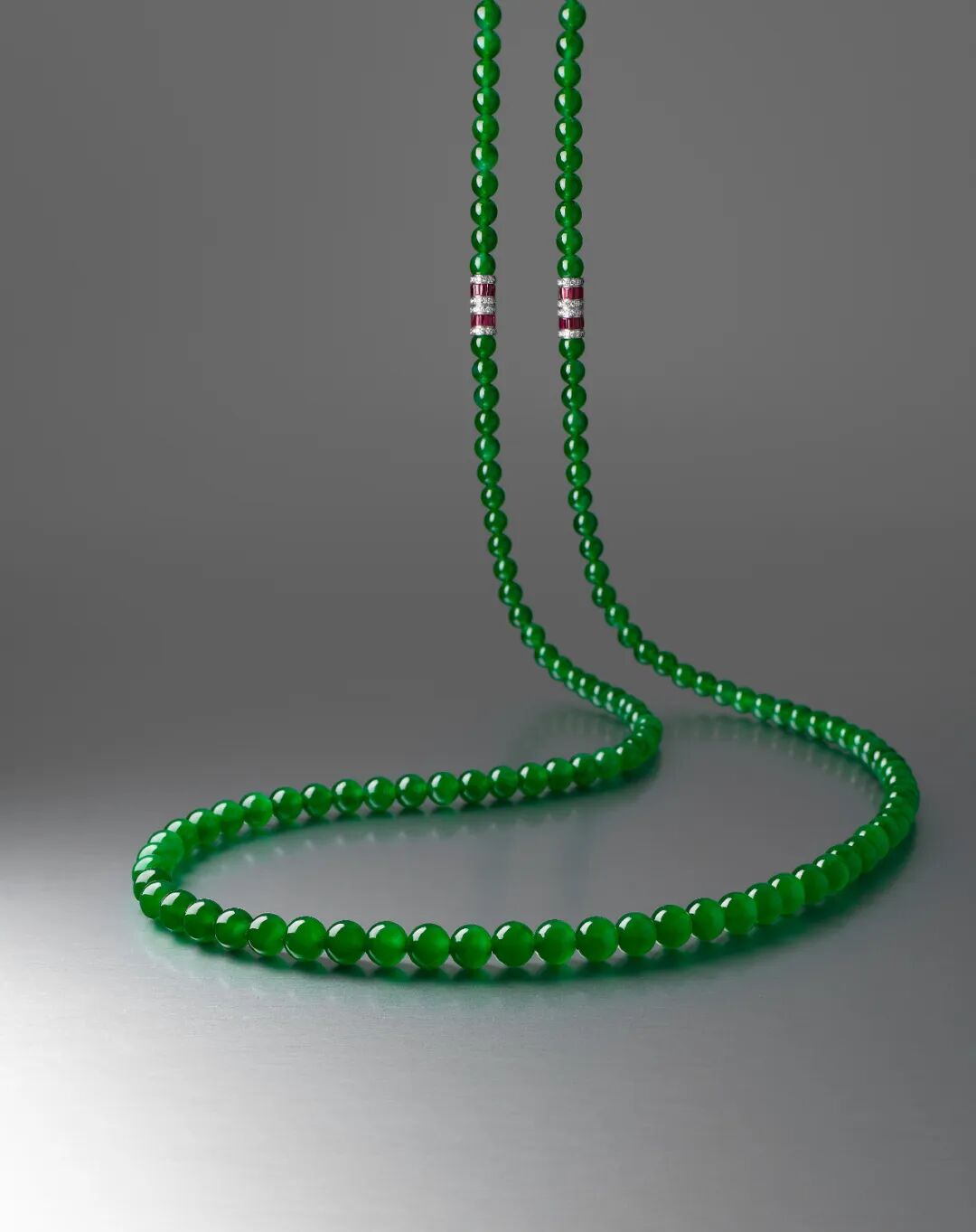 光滑圆浑的切磨样式,最能彰显翡翠的天然品质。翡翠珠链深受世人追捧,价值高昂。只有在同一块原石上取材,才能制作出质色浑然一体的完美翡翠珠链。每切出一颗翡翠珠,就可能要消耗超半原材料。质地与颜色是挑选翡翠珠的两大重要指标,同时,工匠亦会就翡翠珠的透明度、尺寸及切割的对称度作出筛选。款式相配的翡翠珠十分罕有,觅得颜色相称的翡翠珠尤为困难,因此,链条较长或尺寸较大的翡翠珠链往往叫价不菲。