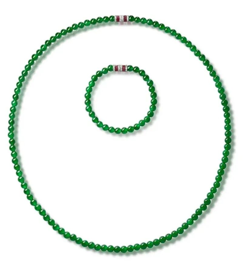 今次上拍的世界纪录级别翡翠珠链共镶43颗「帝王绿」翡翠珠,颗颗翠艳莹润,经典设计凸显翡翠水润清雅、高贵脱俗,美感含蓄内敛。