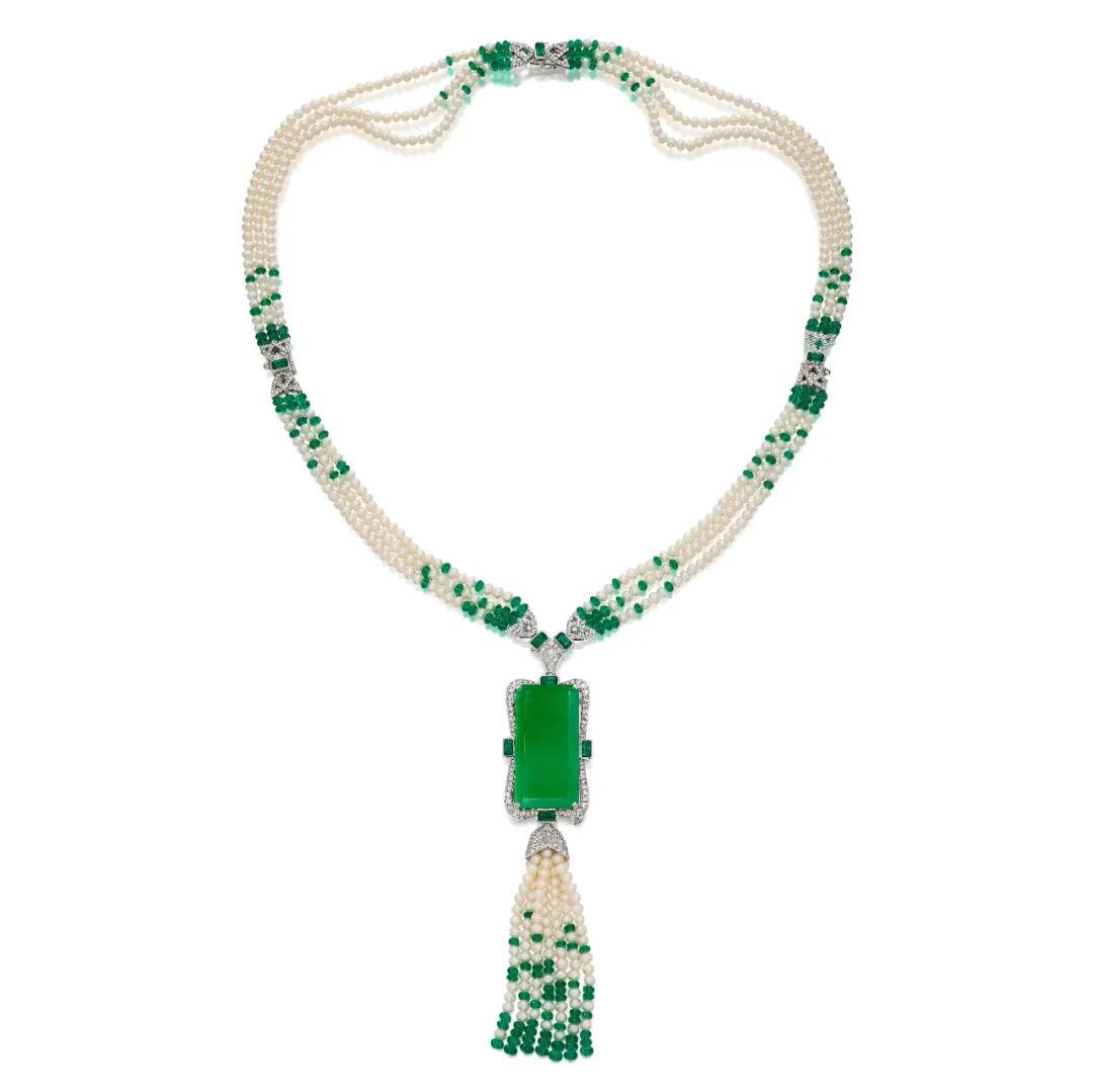 Ilia(建东珠宝)于2019年创立,致力以「东方气蕴,当代表现」的精神推动中国当代翡翠文化和艺术的发展,与大众分享专业翡翠知识及帮助收藏家寻找最珍罕、设计独特、与工艺精湛的翡翠成品。本件作品采用祖母绿、珍珠、钻石,以18k白金镶嵌而成,设计大胆前卫,打破一贯翡翠首饰旧有传统,把西方装饰艺术珠宝风格融入翡翠,以现代的手法重新演绎,打造出一件既时尚又优雅的翡翠首饰。项链以珍罕的缅甸天然翡翠长方玉作为主石,翡翠色泽浓丽,质地幼细,透明度高,玻璃光泽,以经典的祖母绿型切割,配上祖母绿、祖母绿珠、珍珠、风筝形及圆形钻石,珍罕的宝石互相映衬,呈现夺目的动人魅力。作品把法式装饰艺术风格著重的几何对称线条展现得淋漓尽致,再配以华丽的「流苏」造型,柔美灵动,充满时尚感的迷人线条于精彩的细节中互相融汇,展现力量和柔美的交融,佩戴者更能以长、短项链、手链或胸针,多达11种方式佩戴,灵活多变,设计新颖破格,更以无底价上拍,魅力超凡,绝对是一件值得收藏的翡翠作品。