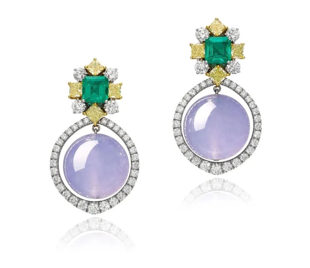珍罕 天然紫罗兰翡翠珠 配 祖母绿 及 钻石耳坠一对
