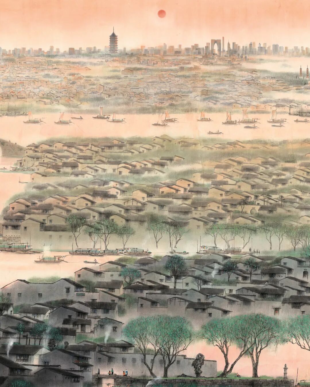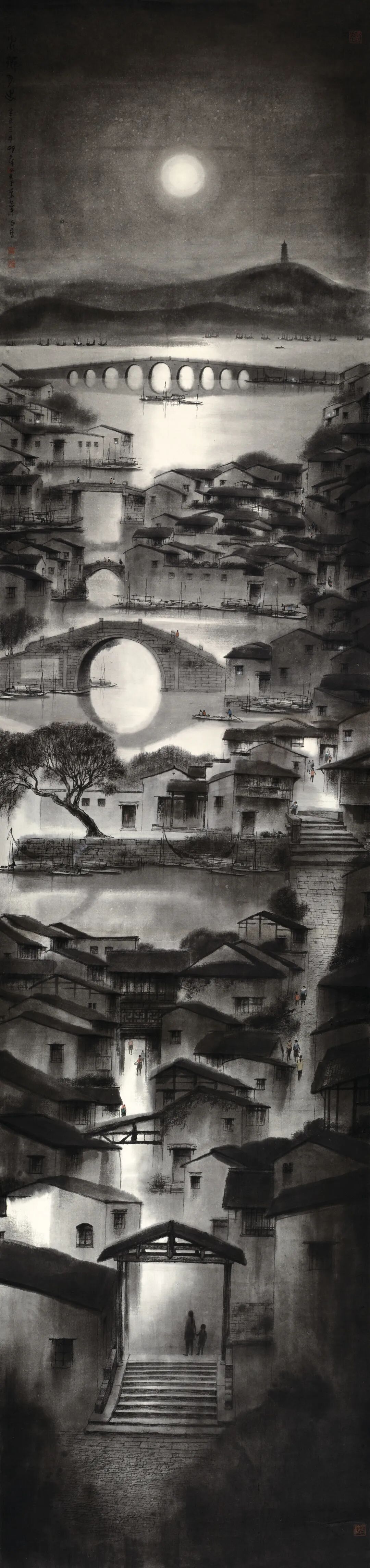 在这次展览中,将展出杨明义在建党100周年时期创作的一百平方尺的巨制《日出之城》:江南水乡的粉墙黛瓦,颇具韵味的小桥流水,在一轮红日的光辉中显现出蒸蒸日上的蓬勃之感,苏州古城换新颜,崭新的现代建筑伫立在地平线上,从老苏州到新苏州和谐完美的过度,这是杨明义用100多天的时间创作的尺幅最大的一幅作品,是他向建党100周年的独特献礼。另外一张巨幅画作《水乡月出》也会在此次展览中展出:月光里的江南水乡静谧婉约,远处的山峦高低起伏,呈现忽隐忽现的动态;月色穿过桥洞留下模糊倒影;广阔的江面上波光粼粼;船只悠悠然飘过;近处的小巷里偶有人影闪过;朦胧美好的月夜水乡在眼前徐徐浮现,正是他心中道不尽的家乡情怀。