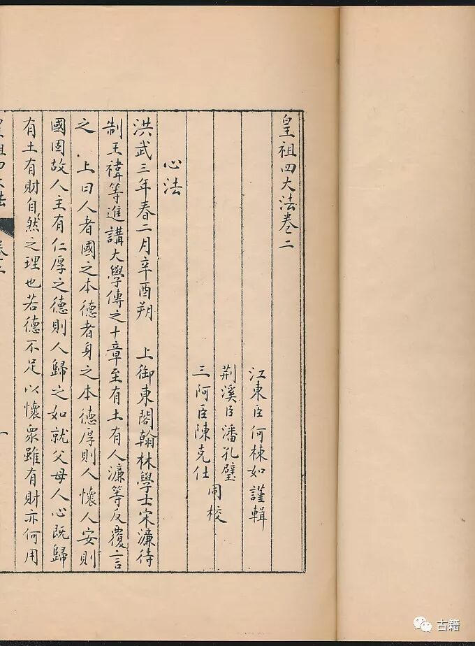《皇祖四大法》书名显示,编者意在利用史著的面貌包含能示法之事,以提挈出可为当世借鉴的朱元璋的治国方法;据史实以考信、求备的宗旨反而退居次位。在该书析分的四类中,“祀法”和“兵法”,是取《左传》中“国之大事,在祀与戎”之意;首列的“心法”,在栋如看来,重心有别于当时学术界盛行的心性之学,而特有照应时事的含义。顾起元的序言明言了这点,他说: