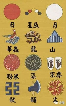 十二章内涵丰富:日、月、星辰,取其照临之意;山,取其稳重、镇定之意;龙,取其神异、变幻之意;华虫,羽毛五色,甚美,取其有文彩之意;宗彝,取供奉、孝养之意;藻,取其洁净之意;火,取其明亮之意;粉米,取有所养之意;黼,取割断、果断之意;黻,取其辨别、明察、背恶向善之意。