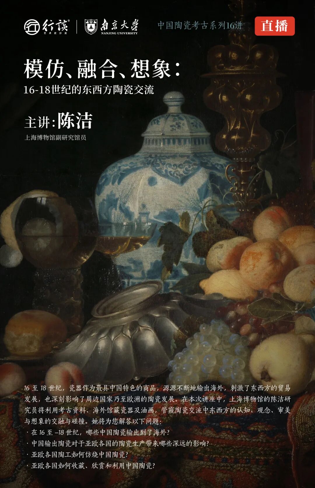 16至18世纪,瓷器作为最具中国特色的商品,源源不断地输出海外,刺激了东西方的贸易发展,也深刻影响了周边国家乃至欧洲的陶瓷发展。在本次讲座中,上海博物馆的陈洁研究员将利用考古资料、海外馆藏瓷器及油画,管窥陶瓷交流中东西方的认知、观念、审美与想象的交融与碰撞。她将为您解答以下问题: