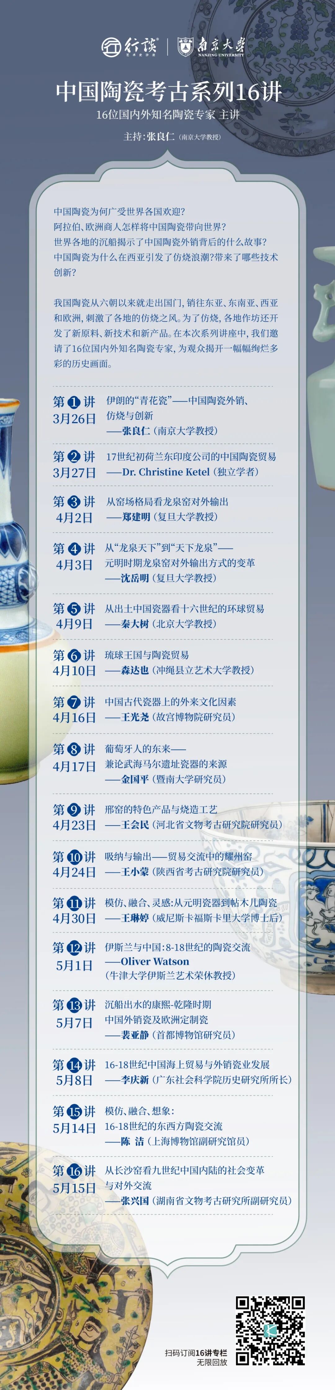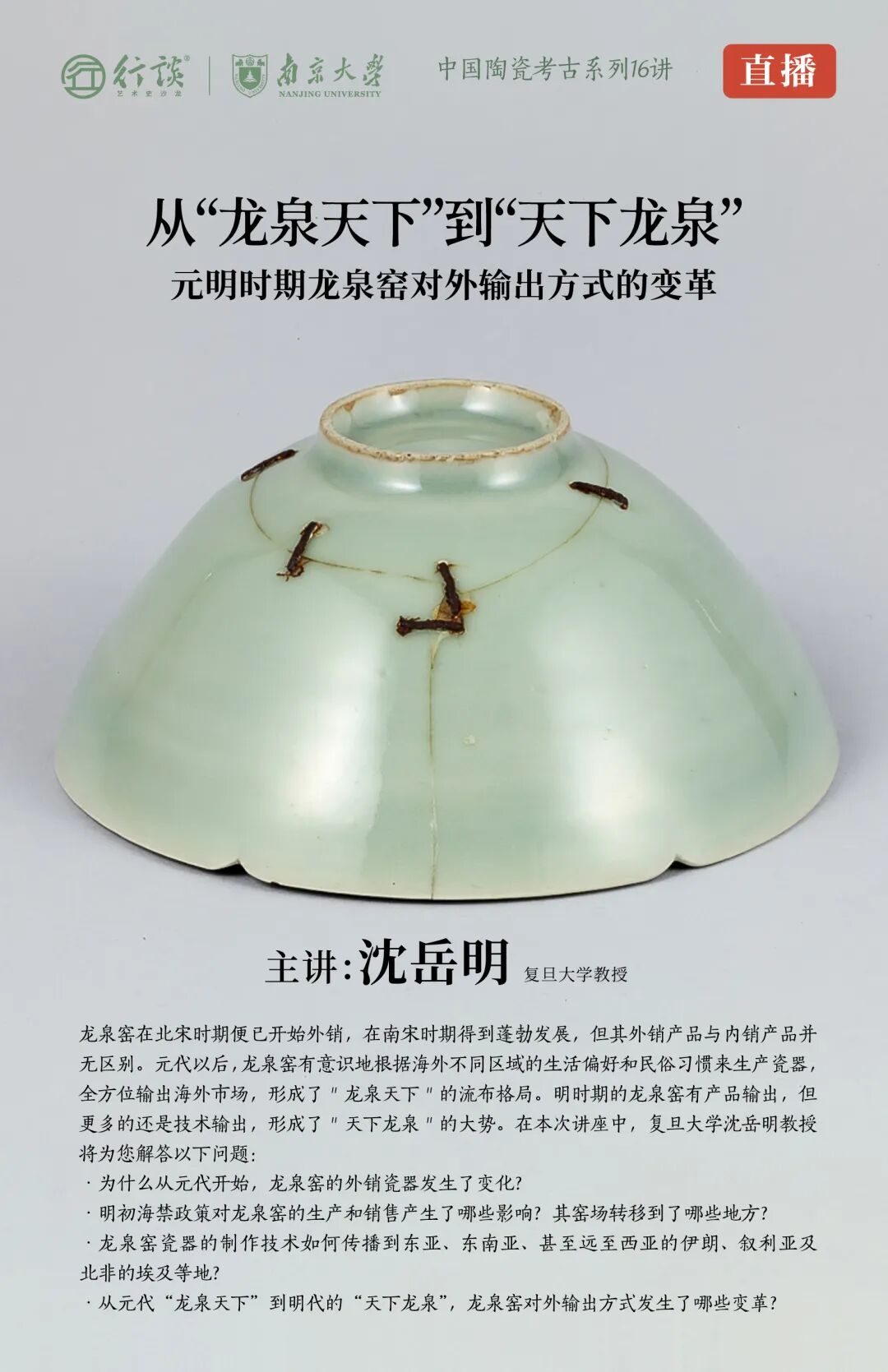 龙泉窑在北宋时期便已开始外销,在南宋时期得到蓬勃发展,但其外销产品与内销产品并无区别。元代以后,龙泉窑有意识地根据海外不同区域的生活偏好和民俗习惯来生产瓷器,全方位输出海外市场,形成了"龙泉天下"的流布格局。明时期的龙泉窑有产品输出,但更多的还是技术输出,形成了"天下龙泉"的大势。在本次讲座中,复旦大学沈岳明教授将为您解答以下问题: