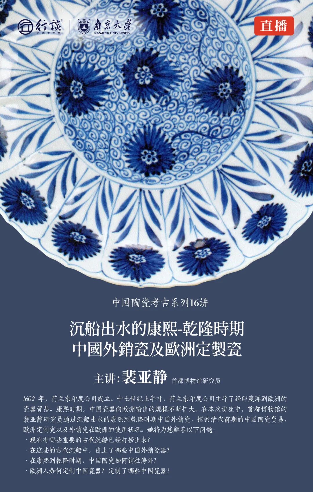 1602年,荷兰东印度公司成立。十七世纪上半叶,荷兰东印度公司主导了经印度洋到欧洲的瓷器贸易。康熙时期,中国瓷器向欧洲输出的规模不断扩大。在本次讲座中,首都博物馆的裴亚静研究员通过沉船出水的康熙到乾隆时期中国外销瓷,探索清代前期的中国陶瓷贸易、欧洲定制瓷以及外销瓷在欧洲的使用状况。她将为您解答以下问题: