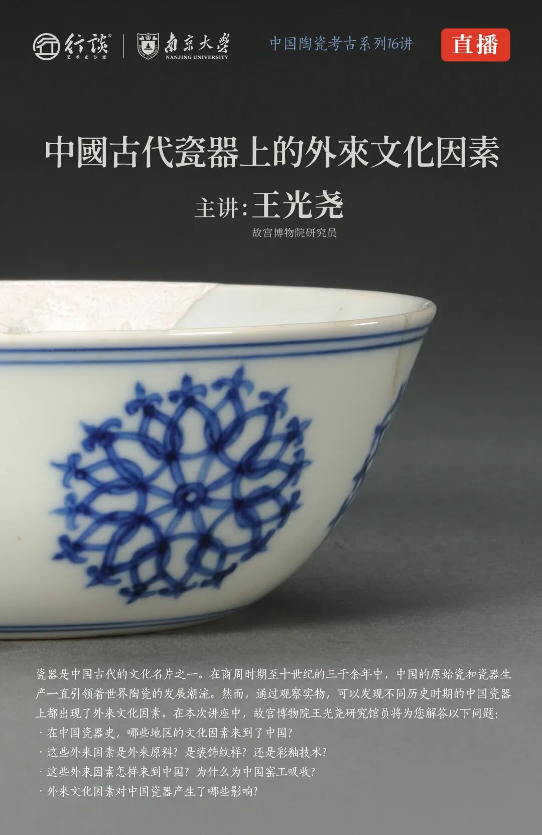 瓷器是中国古代的文化名片之一。在商周时期至十世纪的三千余年中,中国的原始瓷和瓷器生产一直引领着世界陶瓷的发展潮流。然而,通过观察实物,可以发现不同历史时期的中国瓷器上都出现了外来文化因素。在本次讲座中,故宫博物院王光尧研究馆员将为您解答以下问题:
