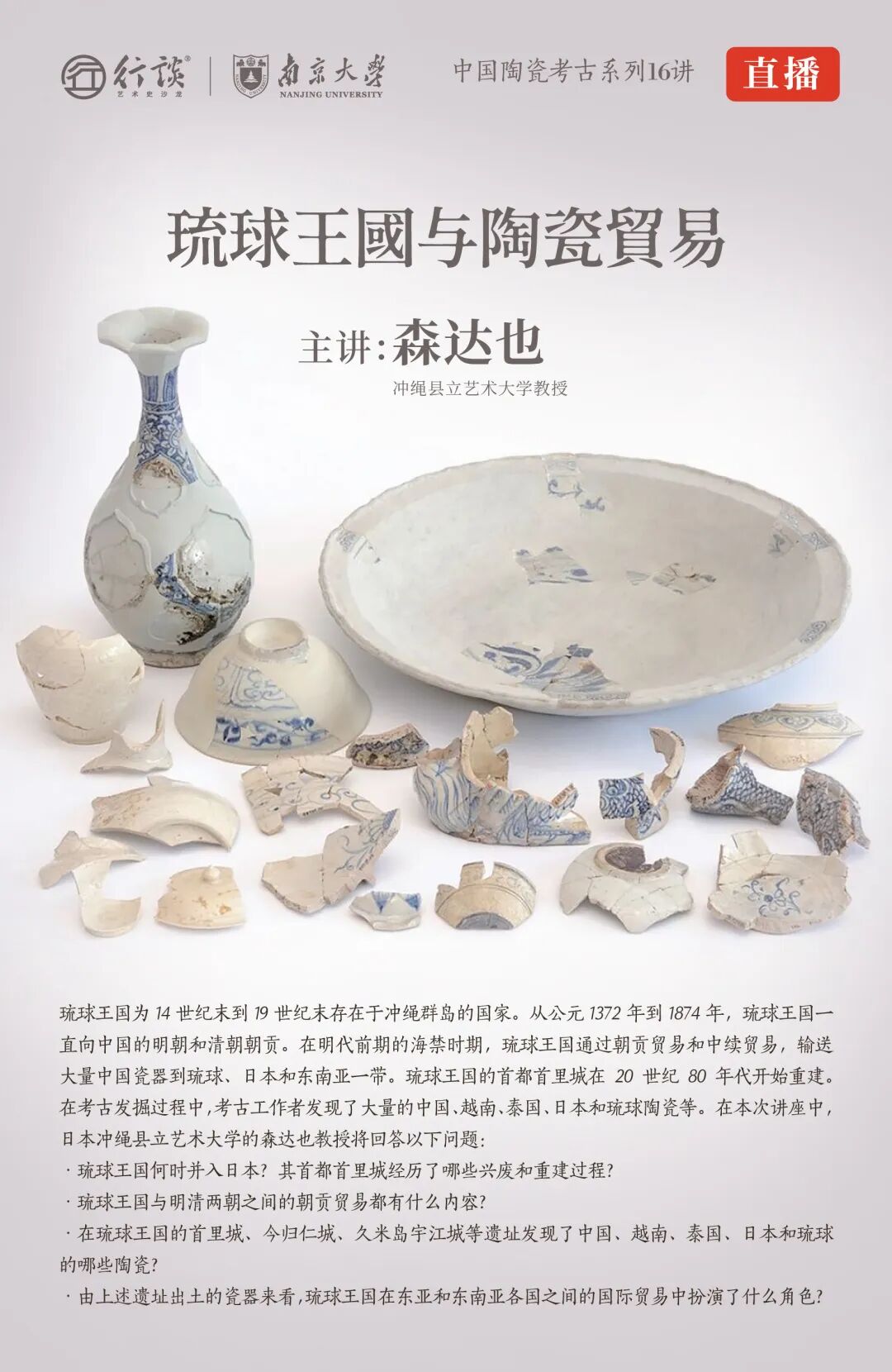 琉球王国为14世纪末到19世纪末存在于冲绳群岛的国家。从公元1372年到1874年,琉球王国一直向中国的明朝和清朝朝贡。在明代前期的海禁时期,琉球王国通过朝贡贸易和中续贸易,输送大量中国瓷器到琉球、日本和东南亚一带。琉球王国的首都首里城在20世纪80年代开始重建。在考古发掘过程中,考古工作者发现了大量的中国、越南、泰国、日本和琉球陶瓷等。在本次讲座中,日本冲绳县立艺术大学的森达也教授将回答以下问题: