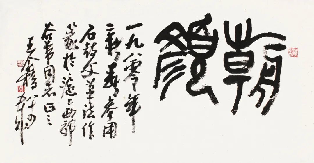 题识:一九八零年新春,参用石鼓文笔法作篆于沪上西郊。谷苇同志正之,王个簃八十四岁。