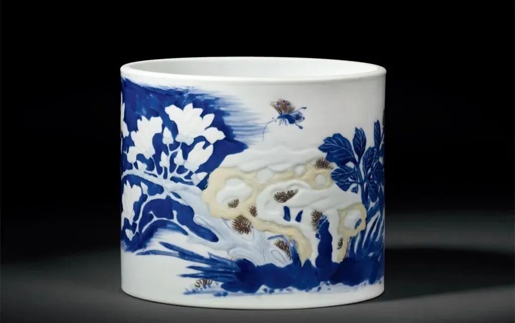 清康熙 釉里三彩玉堂富贵图笔筒