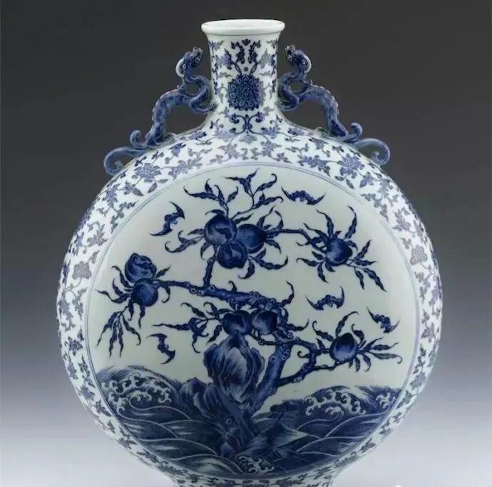 如气势磅礴的寿山福海纹,明代宣德朝的含蓄典雅,而清康熙朝的则加绘鹿、松树、月亮、蝙蝠、云朵等点缀物,尽力将对吉祥的企盼表露。