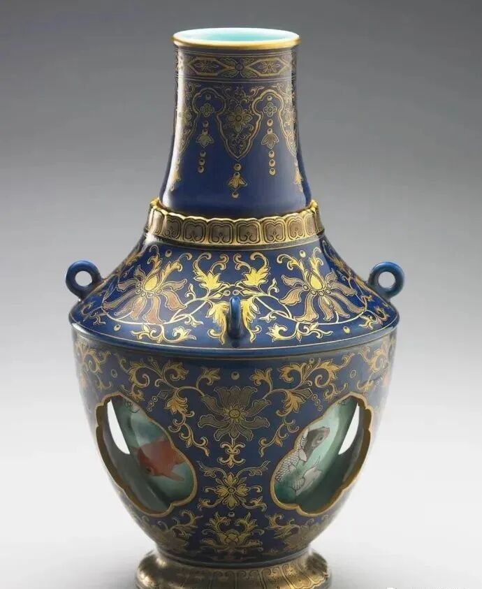清乾隆洋彩霁青地描金鱼游春水瓶