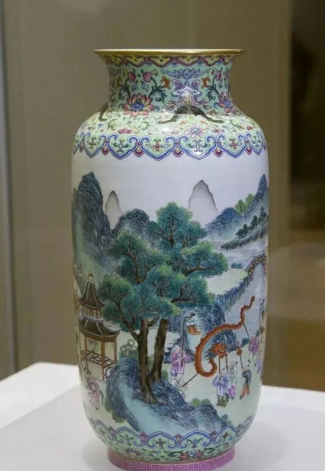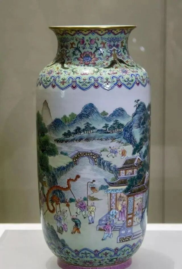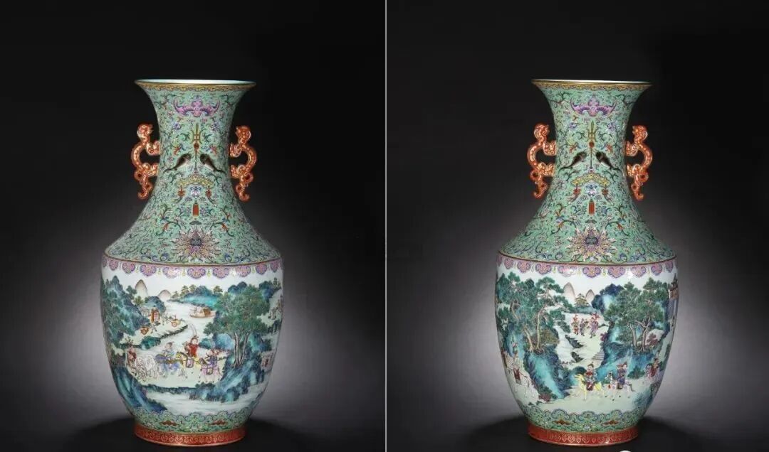 清嘉庆 松石绿地粉彩吉庆有余进宝图双螭耳大瓶