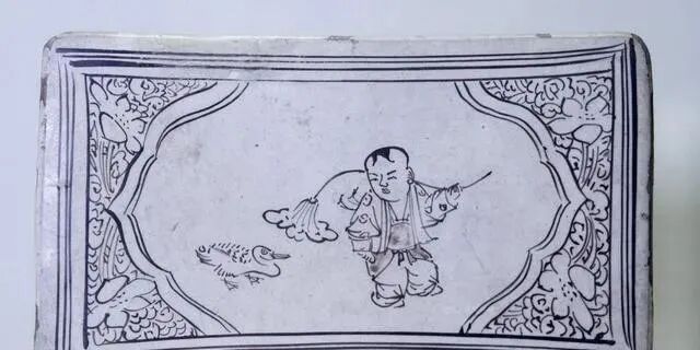 元代 磁州窑白地褐彩婴戏荷鸭纹长方形枕