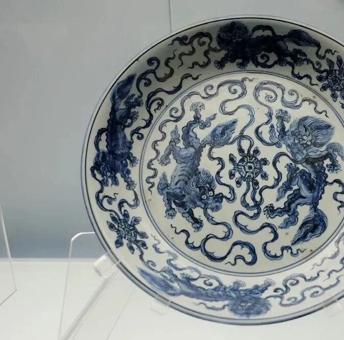 明代 青花双狮戏球纹盘