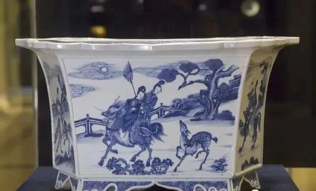 清康熙 青花麻姑献寿纹六棱花口花盆