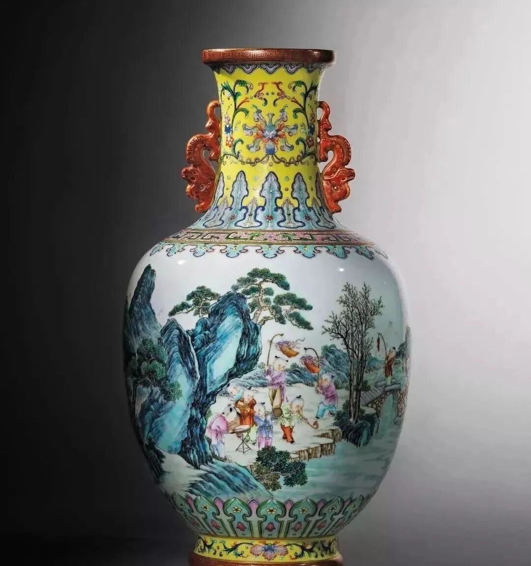 清乾隆 瓷胎洋彩黄地锦上添花莲纹长春百子图双龙耳瓶