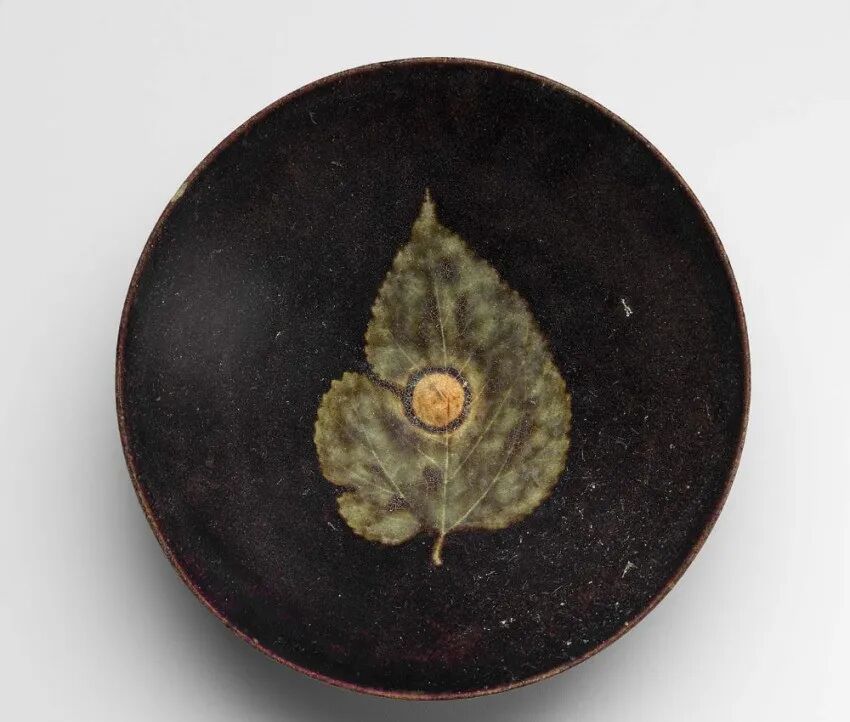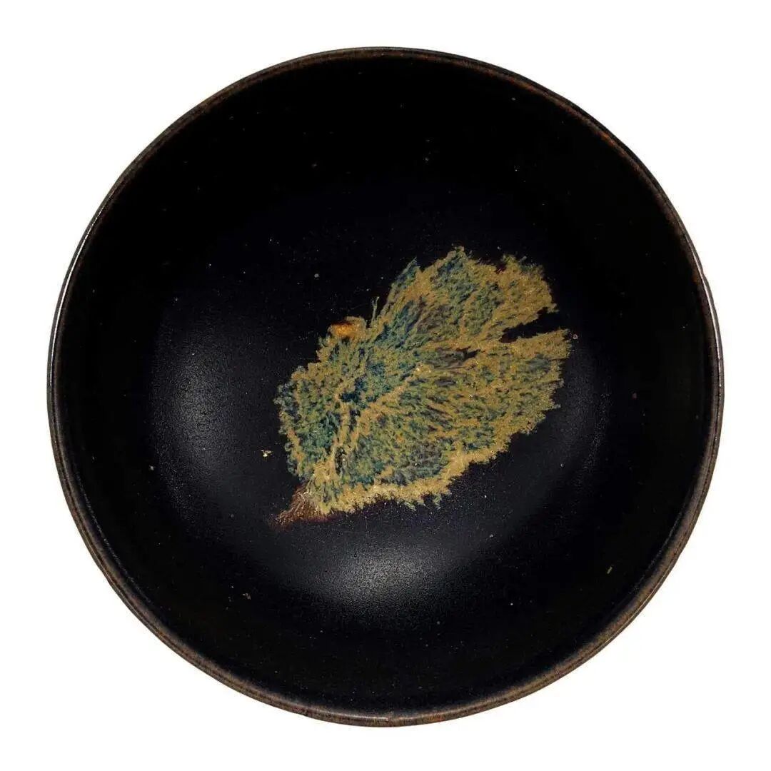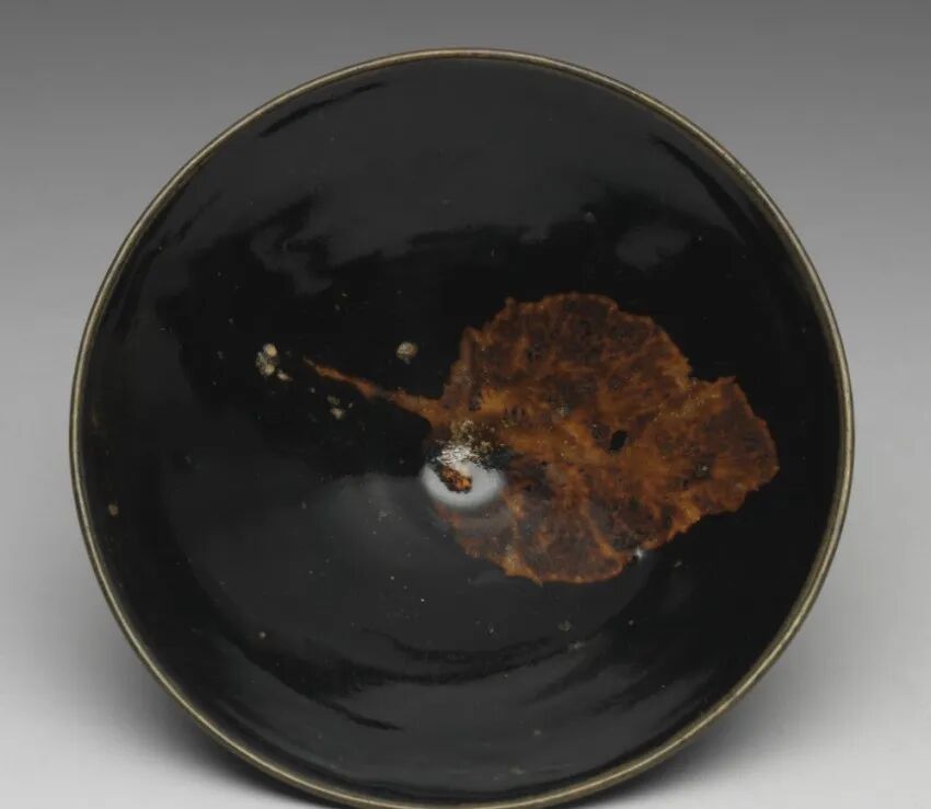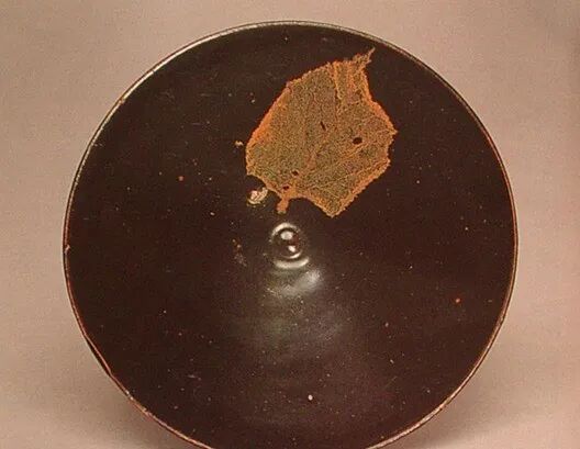 吉州窑在烧制之前,用一种特殊的贴花技术,将经过特殊处理的天然树叶,半张、整叶,或二、三张等相迭成纹地贴在胎体上,再上釉后入窑烧成,树叶烧挥发后留下的痕迹就是木叶纹。这种近乎自然的装饰,尽管没有玳瑁、油滴天目那美丽的结晶,虎皮、鹧鸪天目斑斓的色彩,以及兔毫天目丝丝垂流的窑变效果,但木叶那朴实无华的沉穆,天然去雕饰的工艺,能够引起人们无尽的遐思。细细观察你会发现,在闪烁着深邃黑浑之中,木叶的丝丝茎脉是那样的清晰生动,透过茎脉的空隙,在盏壁漆黑的釉色中,米黄色的叶子像是舞动着的生命的灵性。