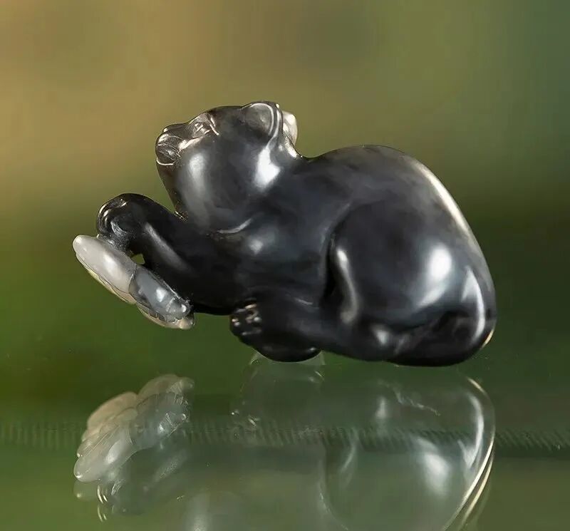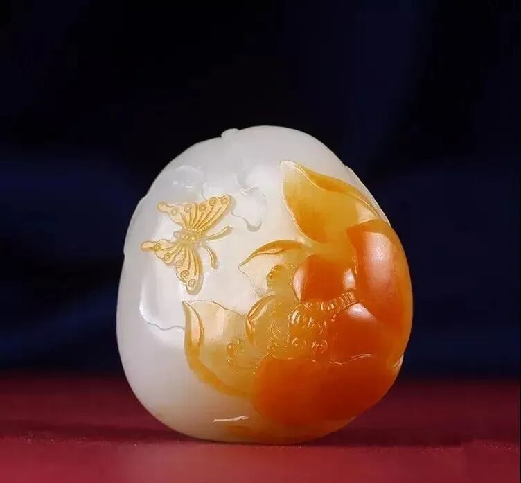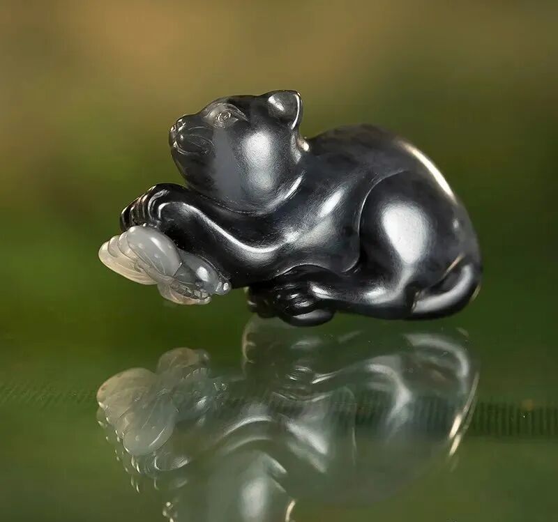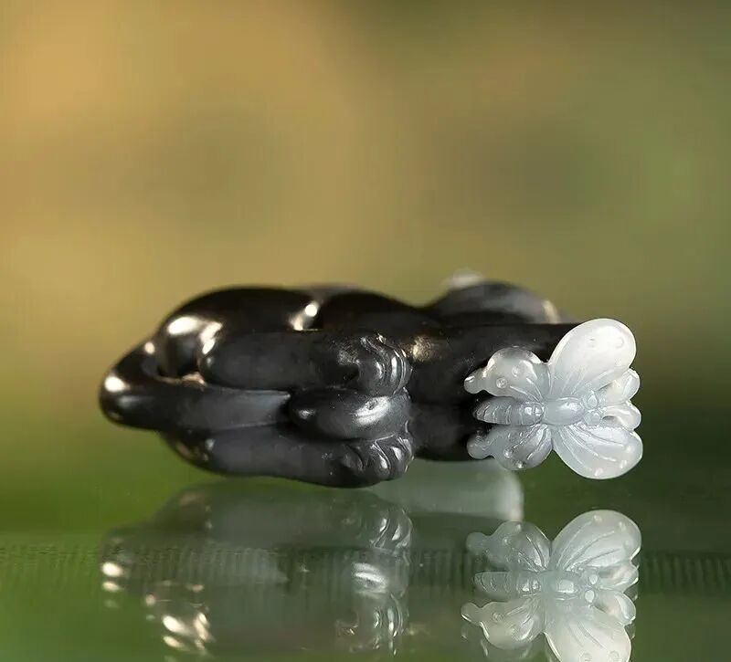 蝴谐音为福,因此在玉雕中,蝴蝶常与牡丹一起出现,寓富贵双全之意,还常同猫搭档,以谐音表示耄耋富贵。