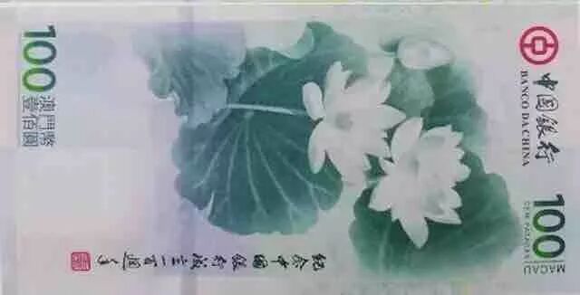 澳门荷花钞背面采用了别具一格的竖式构图, 以绿色为主色调,为中国水墨莲花图。莲花是澳门特别行政区的区花,她是圣洁、祥和、宁静、太平的象征,寓意澳门特别行政区和谐安宁、繁荣昌盛。