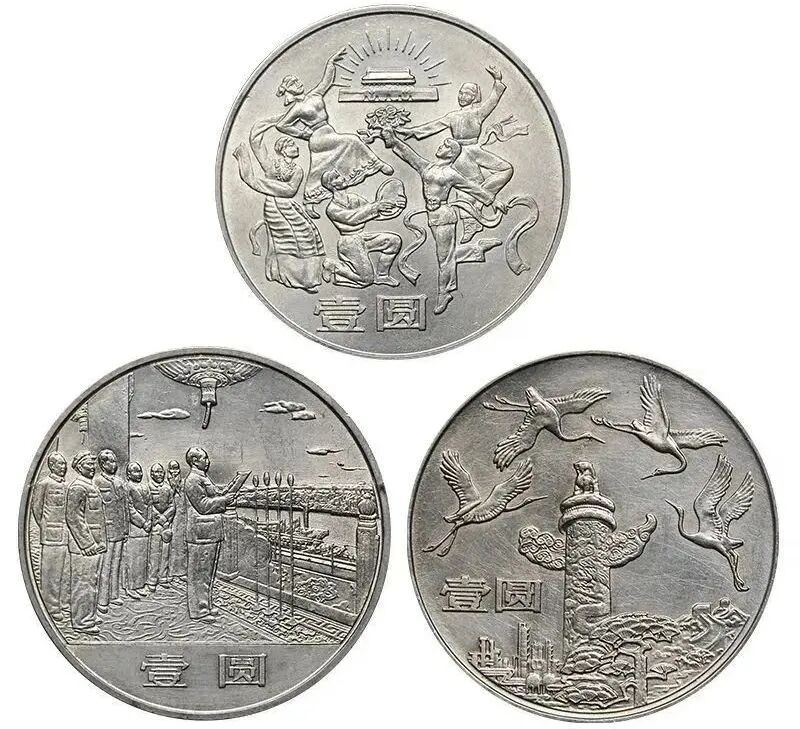 建国35周年纪念币,新中国普通纪念币的龙头,发行于1984年。这组币一套3枚,面值都是1元,但发行量各不相同,其中开国大典仅发行209.2万枚。也就是说,这套币最多也就200多万套。