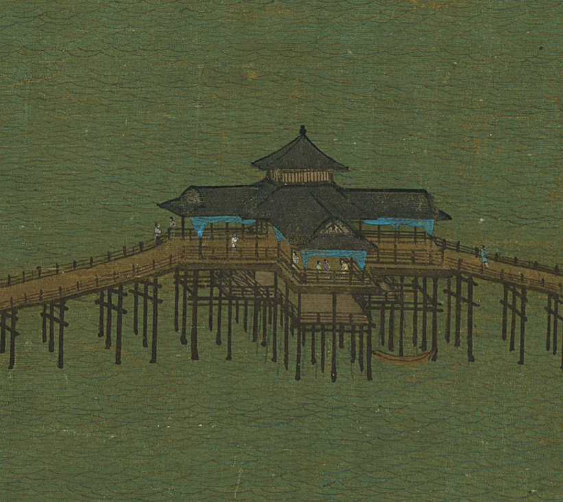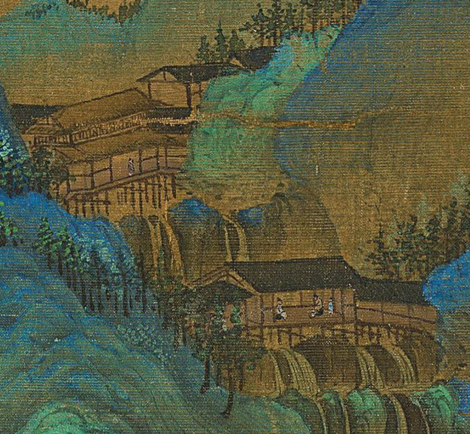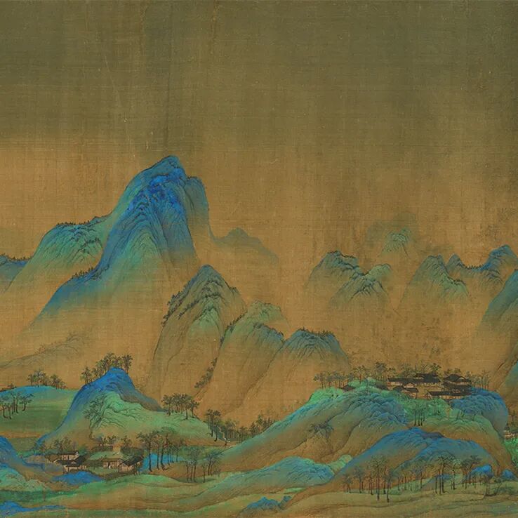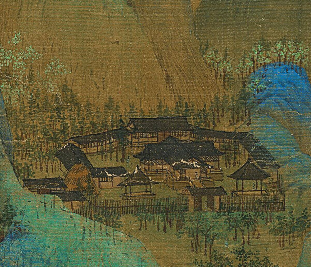 ▲《千里江山图》局部 江山巍峨庇佑,黎民安乐其间