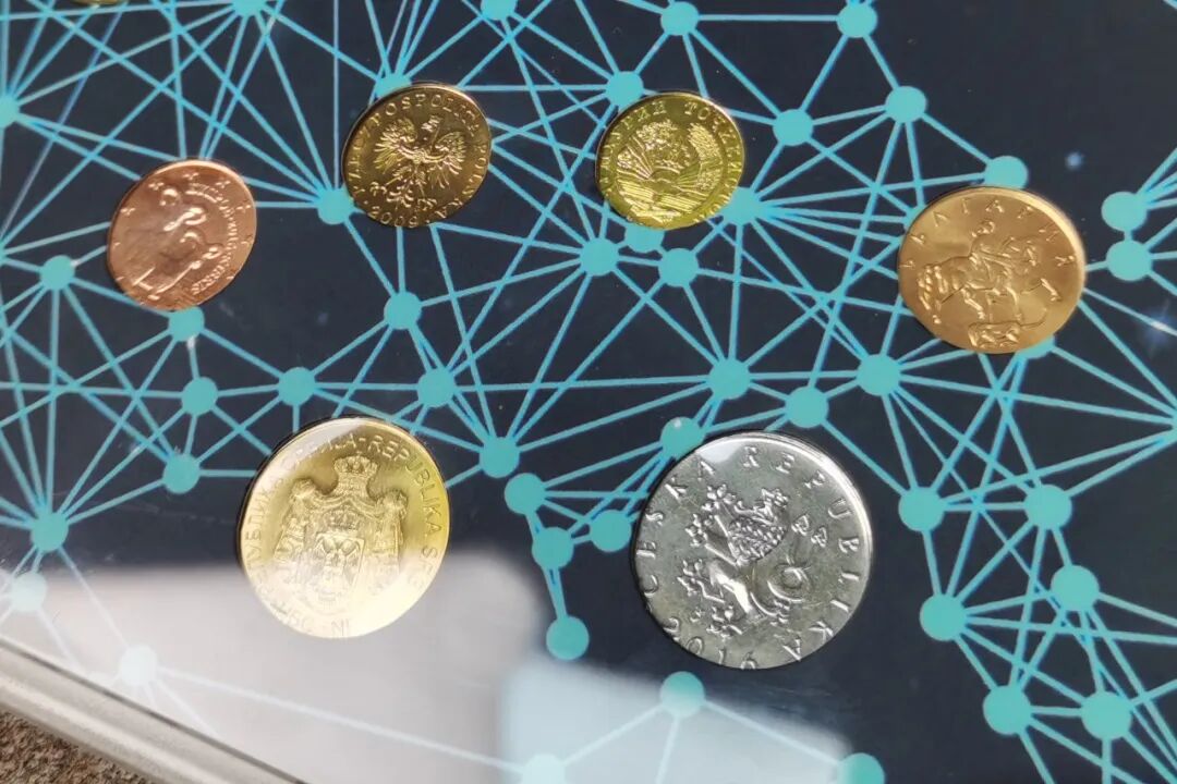 硬币背景上密密麻麻的蓝色网络,勾勒出欧亚大陆和非洲大陆的轮廓,硬币也对应着自己的国家,十分具有现代感!