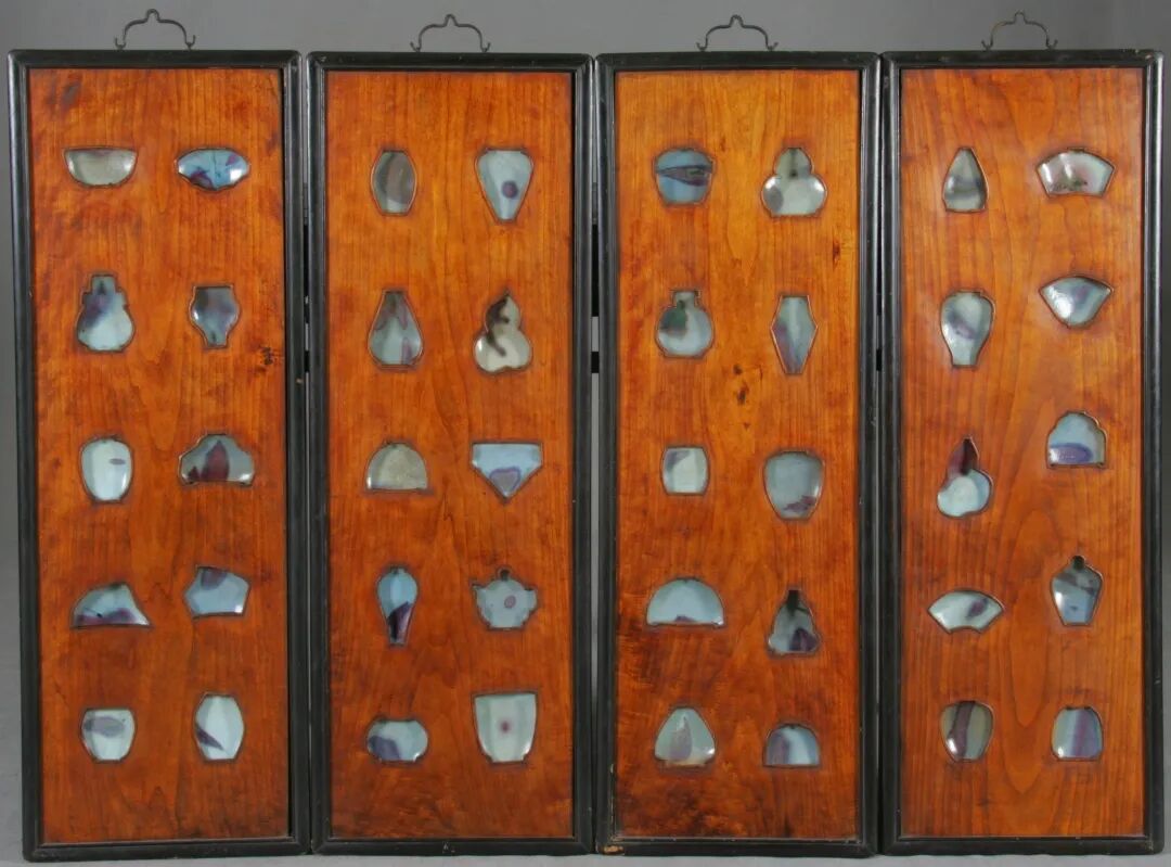 马未都先生多年前曾在北京一家专营旧物的商店,看到一堂【民国钧瓷挂屏】,背板为楠木,边框为榆木,一套四扇,每扇镶十片古钧瓷瓷片,共四十片,片片不同,耐人寻味。几经波折后,终于收入囊中,成为马先生收藏生涯中第一件重要藏品,非常具有纪念意义,现陈列于北京观复博物馆内。