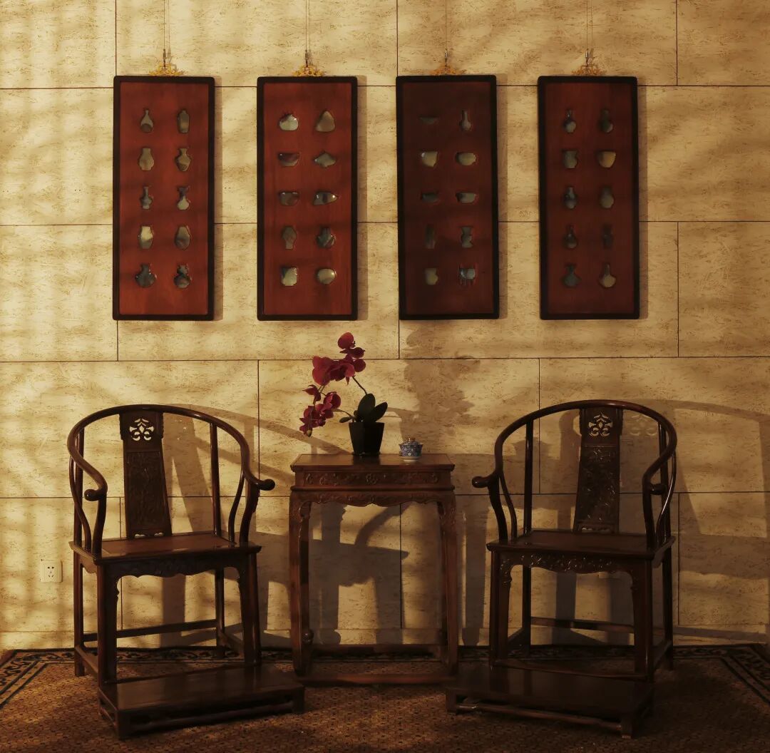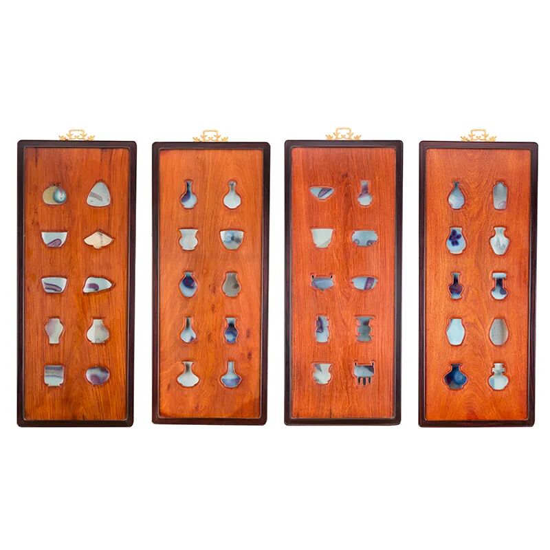 背板取材缅甸黄花梨,边框为大叶紫檀木,每扇挂屏博采经典器型轮廓为样,有贯耳瓶、出戟尊、石榴尊、蒜头瓶、玉壶春瓶、胆瓶、折沿洗、香炉、渣斗、碗、磬等达几十种。