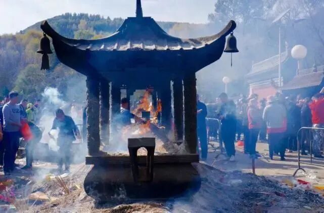 一座方型大香炉前,用铁皮围成半圆形,里面的火堆熊熊燃烧,还有人在往火堆里投放香纸香烛等供品。不过这里说明一下,这个已经没有了,五爷庙前没有大肆烧香的炉子和人了。![]()