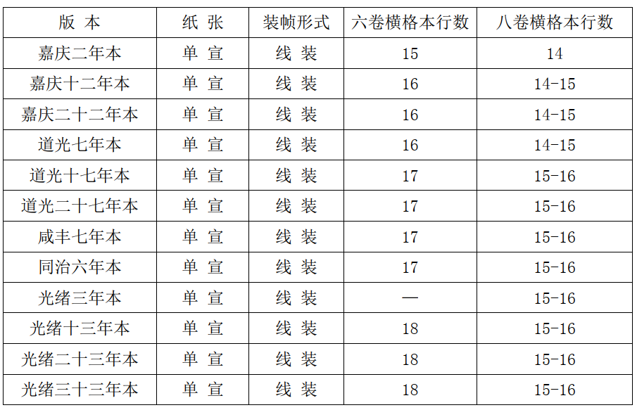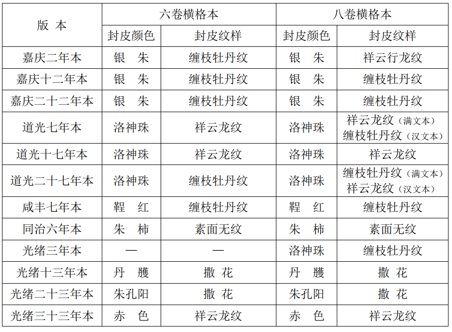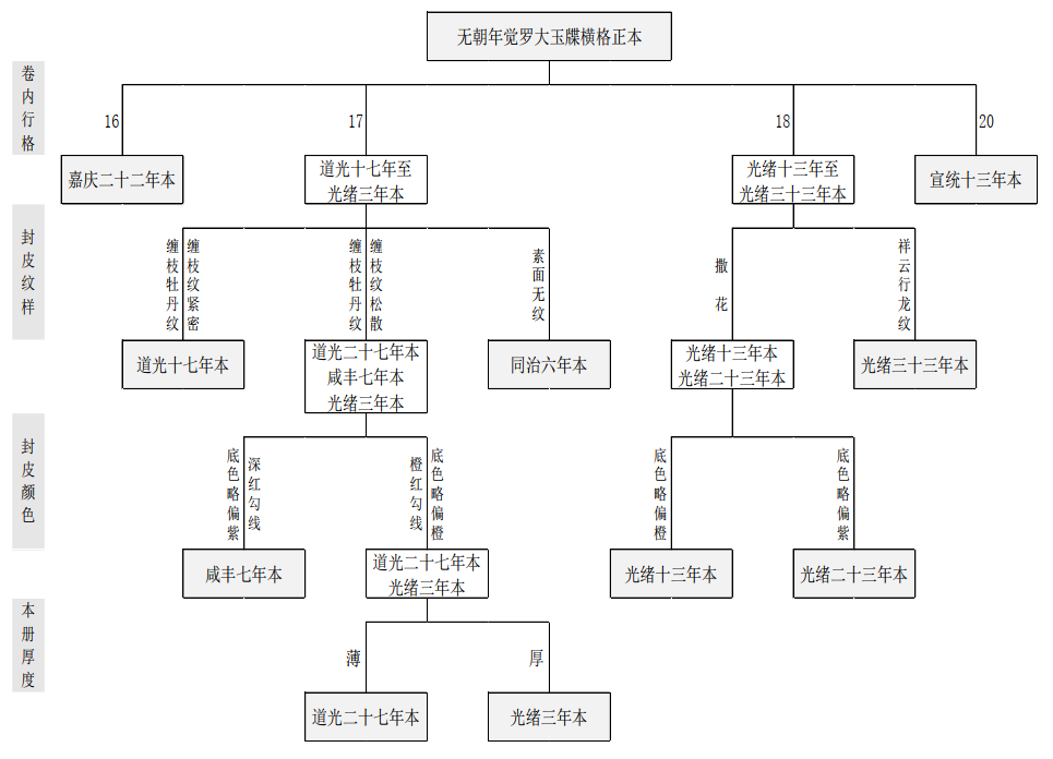 各版本的封皮材质,也在一定程度上反映了彼时国力的强弱。前期所用丝绫纹理细密、染色均匀、纹样清晰,历数百年仍觉颜色如新;道光朝以后工艺明显粗糙,改丝绫为锦绫,多见起球、褪色、纹样模糊等情况。同治六年(1867)本所用丝绫素面无纹,质量欠佳,存在严重的染色不匀,或因此前数年江南俱在太平天国治下,清廷所需丝织品的制造和运输遇到困难。玉牒正本多在各册卷首有纂修序言,卷末有填写纂修时间的栏框,这是辨识其版本的主要依据。但嘉庆二十二年本、道光十七年本及此后各版本的大玉牒横格本未见此类信息,宗室小玉牒横格多卷本、觉罗小玉牒横格八卷本也是如此。故在整理著录的过程中,需对上述玉牒的纂修时间进行确定。按册数计,需辨别版本的大玉牒正本约占一史馆现存数量的十分之一,小玉牒正本则则达三分之二以上。玉牒副本和备查本则基本未明确标注纂修时间。宗室玉牒因横格本卷首单列了“帝系”,纂修时间的确定相对容易。可先据封皮颜色判断其为宗室玉牒,按长宽尺寸区分大、小玉牒,按封皮材质(绫、纸、布)区分正本、副本、备查本,按在位皇帝确定纂修朝代,[28]最后按卷内行格数和帝系所载皇帝直系子孙的存殁情况即可定位到年。如下表,可知根据以上要素即可辨别光绪朝各版本。![]()