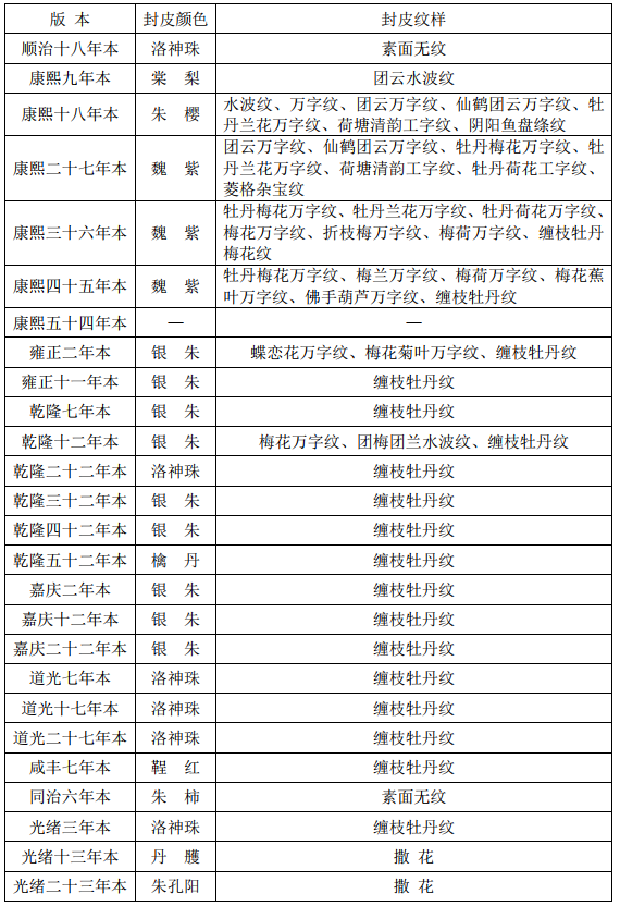 雍正二年(1724)至乾隆十二年本,觉罗玉牒的封皮纹样日渐统一,且四次纂修都采用了“缠枝牡丹”这一纹样,乾隆二十二年后的各版本则主要采用缠枝牡丹纹和祥云龙纹,佛、道的因素渐渐退出,所选纹样与中原文化的连接却更为明显,比如满而密的缠枝纹,花头的云勾状曲线正是元明以来广泛使用的“伊斯兰三叶式”。[27] “牡丹”“龙”“云”均是传统纹样中常见的元素,富贵尊荣。但康熙朝的纹样元素显然更为丰富,且大量采用了梅、兰、荷等在传统文化中通常被认为高洁清雅的意象,将清中期后长期沿用的牡丹、云龙等纹样与之相比,可见清廷的审美呈现出一种世俗化、程式化的走向。觉罗玉牒的封皮颜色也由前期较为沉稳的魏紫、银朱等色,逐步转变为朱孔阳、赤色之类更为鲜亮的颜色,整体感觉从端庄持重转为艳丽张扬。与之相应的,伴随着政权的稳固和国力的发展,统治阶层或浮华奢靡,或因循守旧。![]()