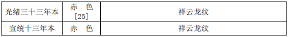 大玉牒成书后,一份送往盛京,其余留在北京。留京者初藏于皇史宬金匮和内务府库房中,嘉庆十二年起俱移存景山寿皇殿,由工部打造龙柜以供收贮。一史馆今存龙柜86个。收贮宗室玉牒的龙柜为库金色,门上刻有满汉文对照的“清代宗室谱牒”字样;觉罗的则为朱红色系,[23]门上刻有满汉文对照的“清代宗族谱牒”字样。龙柜均为对开门,插锁锁头多采鱼形、如意形等吉祥样式,其上原挂有标明所存玉牒纂修时间的木牌,今多遗失。除柜底外,龙柜五面俱戗金填漆,柜顶饰坐龙一,正面饰升龙二,背面饰降龙二,两侧则为一升一降双龙戏珠,并配有海水江崖、莲花、流云等纹样。各朝纹饰略有不同,如早期升龙多为相对平视,后渐转为双双昂首向上,又如道光朝龙柜的福山明显略小些,云纹也略少些。宣统朝龙柜较为简陋,用漆大不如前,今多开裂,且仅以墨笔绘龙纹于上。小玉牒则于乾清宫安设格架收贮。玉牒无论包背装还是线装,封皮多为绫质。宗室玉牒封皮基本为明黄,觉罗玉牒虽均为红色,但各版本颇不相同,纹样更是丰富多彩。以觉罗玉牒正本为例,将其封皮颜色与纹样列于表3。![]()