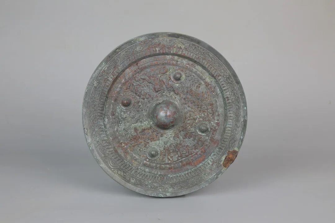 自战国开始,在历经了四百余年的思想探索、碰撞和融合之后,一套以天地阴阳、五行相生相克为宇宙观的信仰体系在汉代宣告建立。这件铜镜上就刻有西王母、东王公、九尾狐、三足乌、羽人、青龙等神仙异兽纹饰。